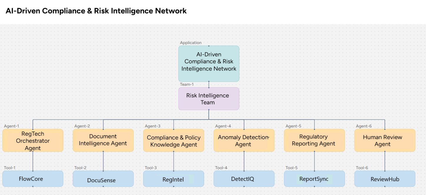 Organizations face rapidly changing regulations (GDPR, FATCA, MiFID, etc.), voluminous filings, and high-stakes transaction monitoring. Manual review and siloed systems create compliance lag, missed risks, and costly remediation. This template automates continuous monitoring, structured regulatory knowledge, document extraction, anomaly detection, and submission preparation using a coordinated multi-agent network—reducing time-to-compliance and surfacing proactive regulatory insights.