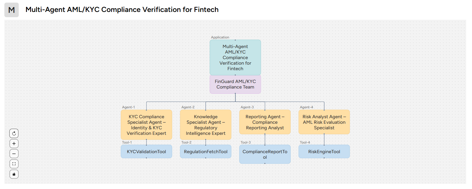 This template leverages five specialized AI agents running in a multi-agent environment using Syncloop. Each agent handles a distinct part of the AML/KYC process—ranging from document analysis to regulatory referencing and risk evaluation. The agents communicate through Syncloop APIs, allowing each to contribute insights and data toward the generation of a final compliance report.