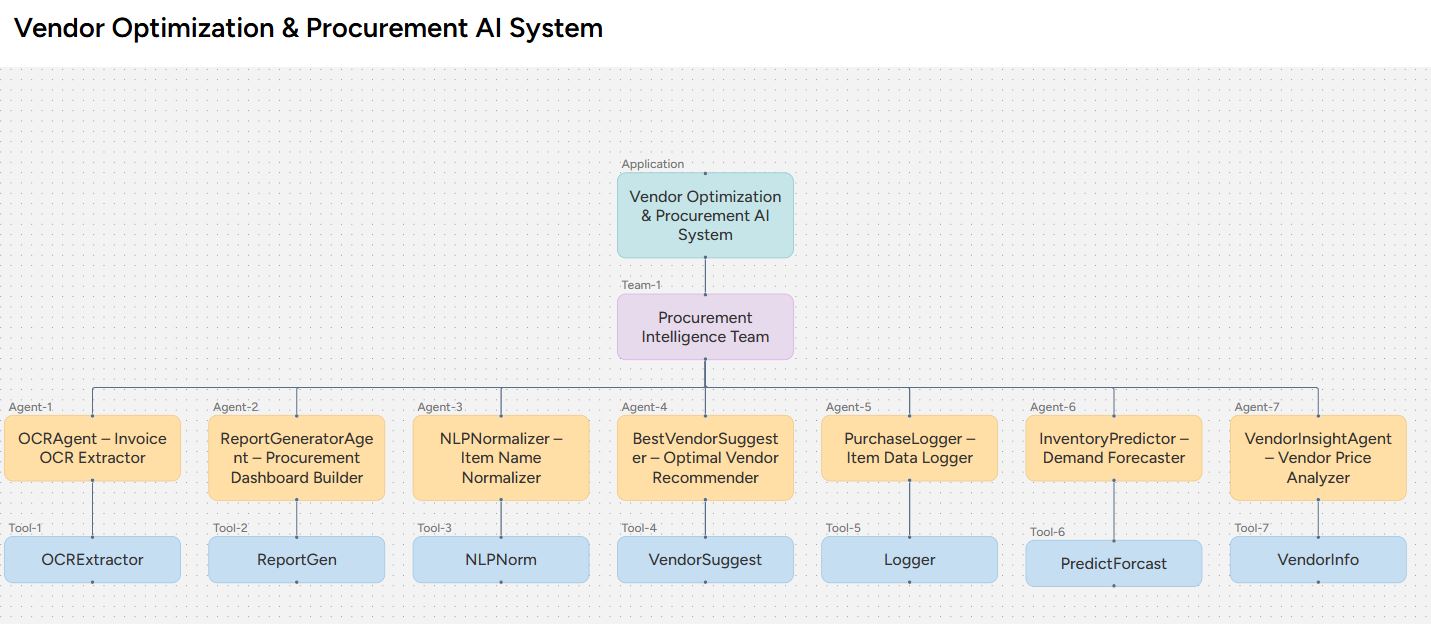 - ReportGeneratorAgent compiles all outputs into a visual procurement dashboard.